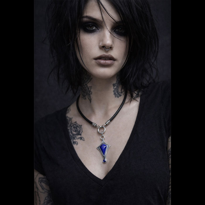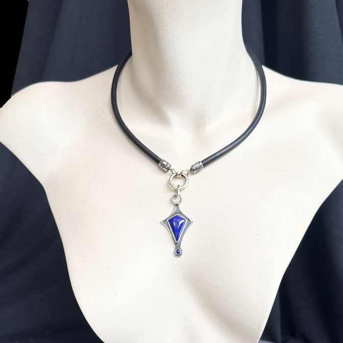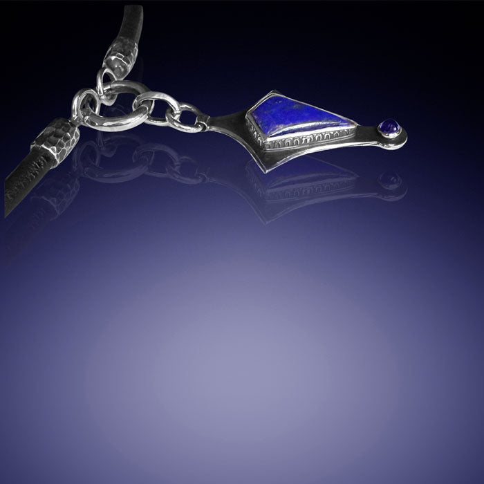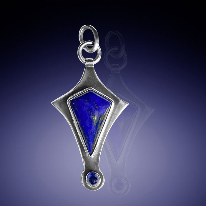 This one-of-a-kind lapis lazuli and cabachon sapphire charm captures the stone's rich blue depths with natural veining and flecks of gold. Measuring approximately 2 inches, it pairs beautifully with chains, leather cords, or your favorite charm necklace. It is genuinely unique, making it a distinctive addition to your jewelry collection. Hand-fabricated in Sterling Silver