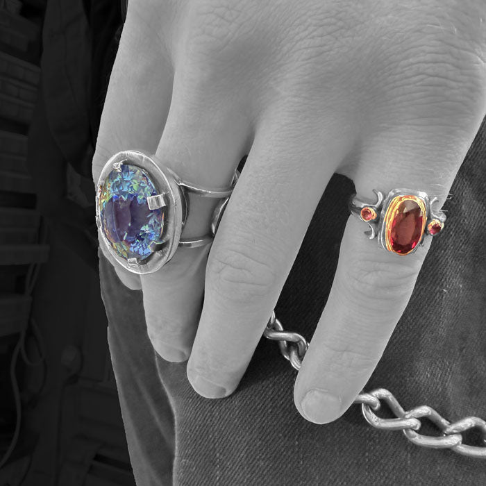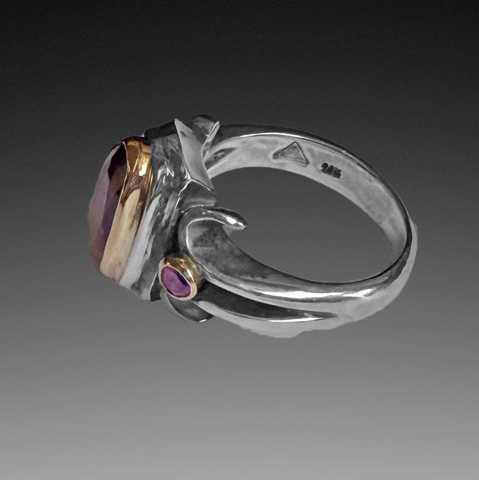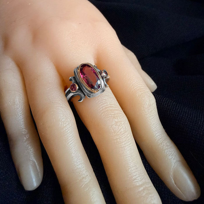 This exquisite ring draws inspiration from the ornate grandeur of Gothic and Byzantine design, reimagined for the modern wearer. Crafted in lsterling silver with delicate 14k pink gold bezels, it marries timeless elegance with everyday wearability. The centerpiece showcases a mesmerizing rubellite garnet that radiates a deep, jewel-toned raspberry sparkle, complemented by lighter companion stones that dance with subtle luminescence. A true one-of-a-kind treasure, sized at 7.25, this piece whispers of romance and refined sophistication.
