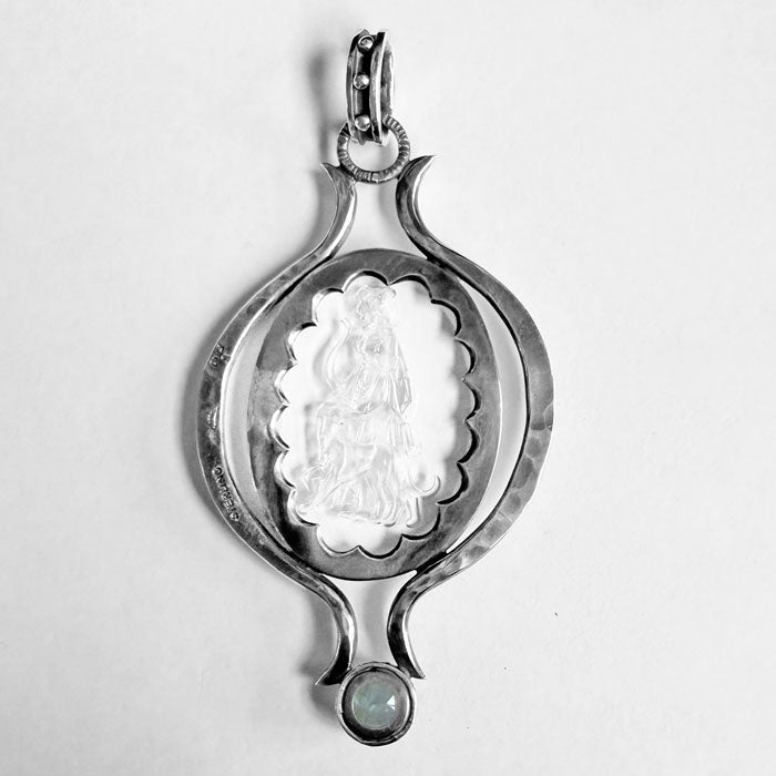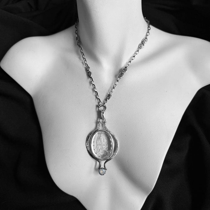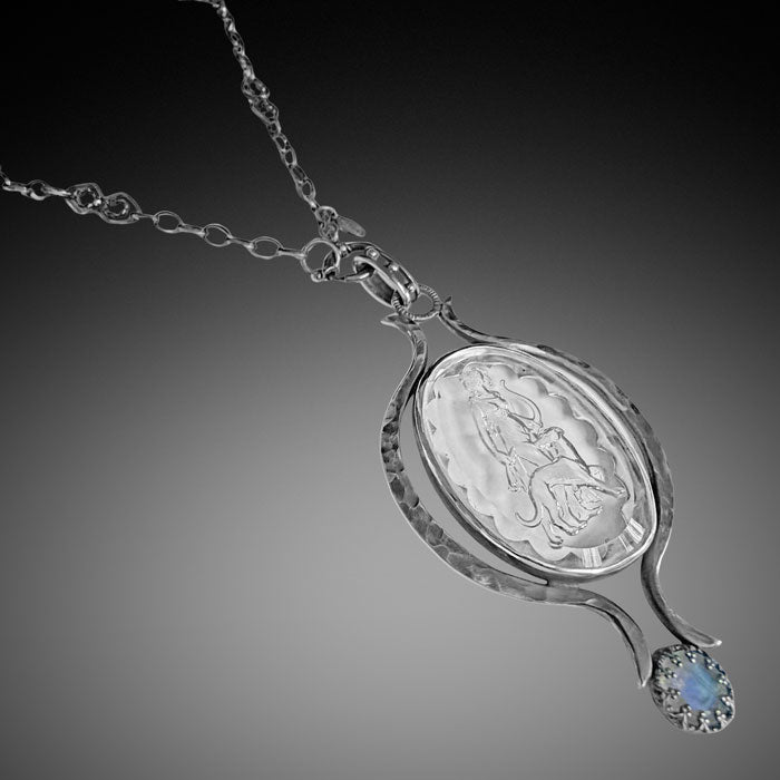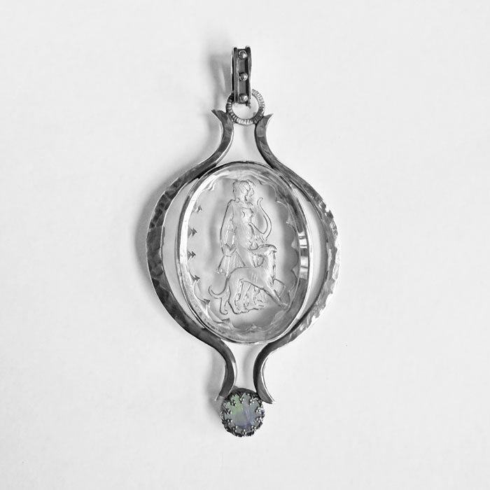 This pendant features Diana with her dog on a pressed glass intaglio. It is handcrafted in sterling silverwith a faceted rainbow moonstone at the tip. Stamped "only one". Featured here on the Filagree Detachable charm Necklace