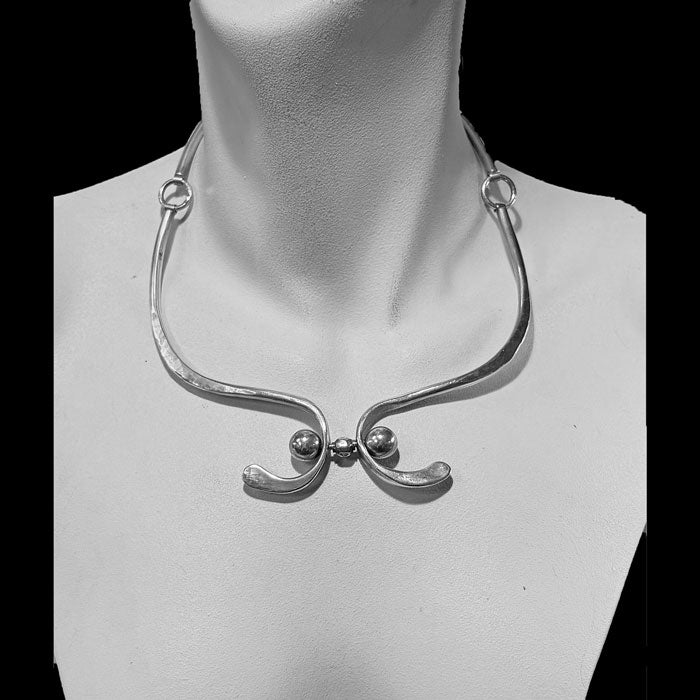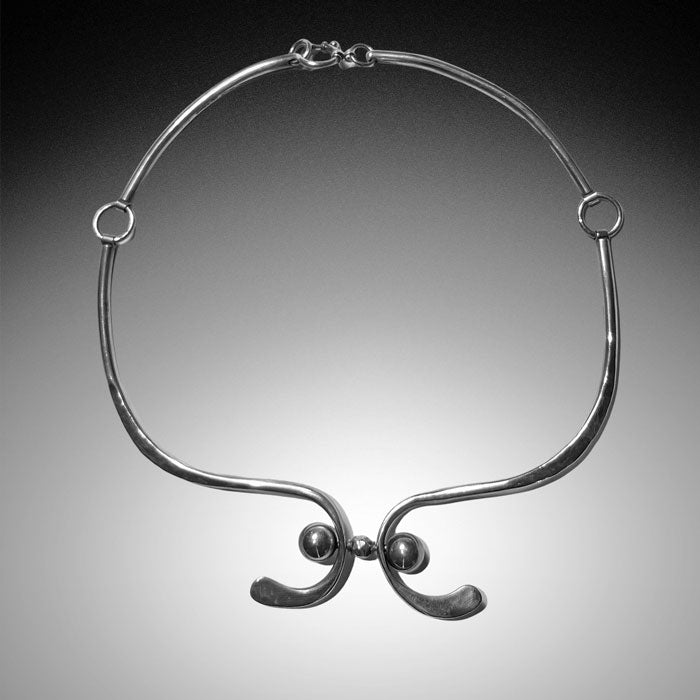 Embrace your bold side with this hand-forged silver choker that channels mid-century modern flair. The dynamic interplay of side rings and a striking central ball creates visual intrigue and movement, while its streamlined design keeps it effortlessly wearable. Quirky, sophisticated, and undeniably fun—the perfect piece for those who refuse to blend in. Unisex and one-of-a-kind